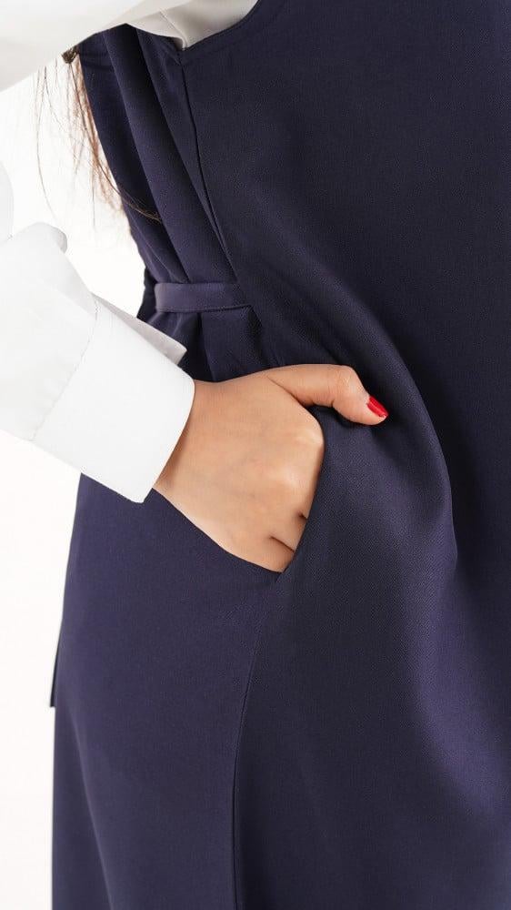 تم تصميمة شيال ساده من خامة كريب والياقة بتصميم V من الامام يغلق بسحاب مخفي وربطه في الخلف، مع وجود جيب جانبي مخفي