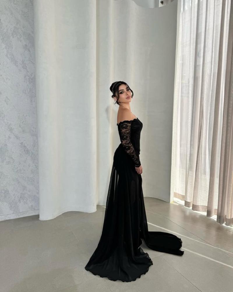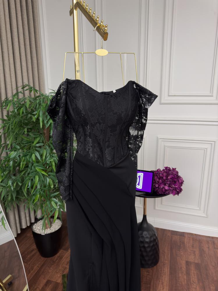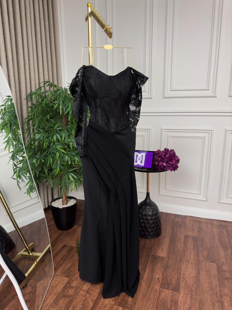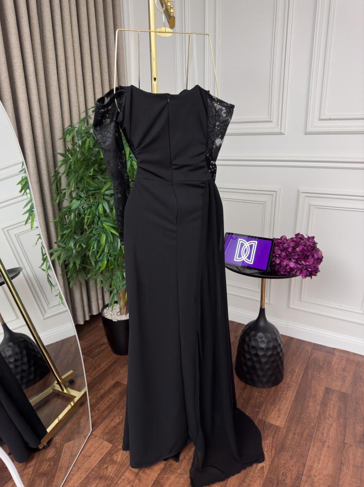 فستان اسود فاخر بدون أكمام بفتحة ساق