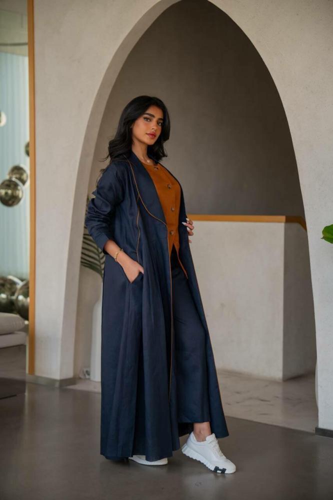 تميزي بإطلالة أنيقة وعصرية مع هذه العباية المصممة من قماش الينن الطبيعي، بلون كحلي او اسود أنيق مع تفاصيل باللون النحاسي، تأتي مع طقم داخلي مكون من صديرية بلون نحاسي وبنطال واسع بلون كحلي، لتمنحك مظهراً متكاملاً وراحة طوال اليوم.