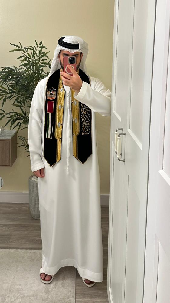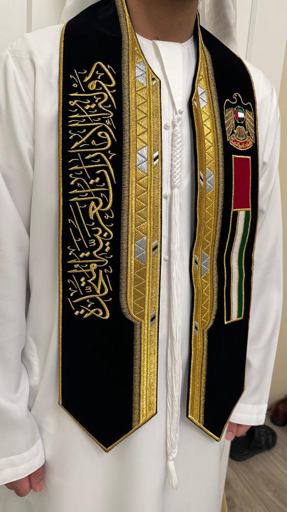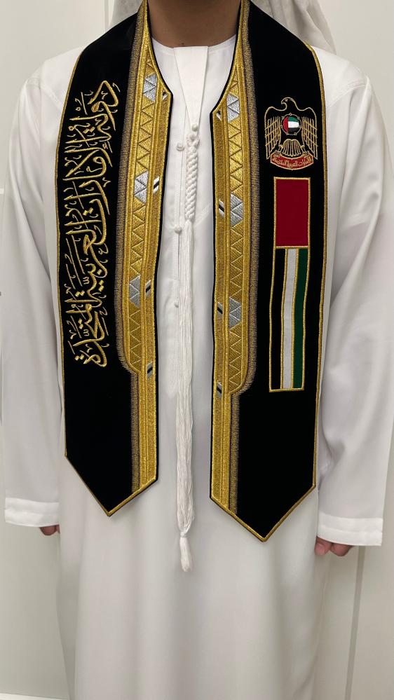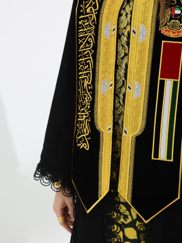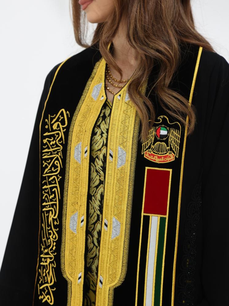 علم من المخمل باللون الزري الذهبي بدقة البشت الإماراتي مع شعار واسم الدولة المكتوب يدوياً بالخط العربي وألوان مع حقيبة فاخرة متعددة الاستخدامات