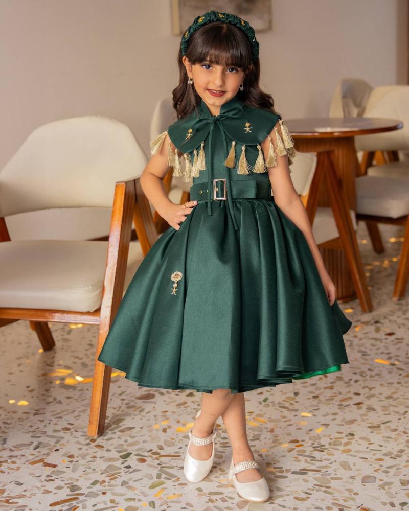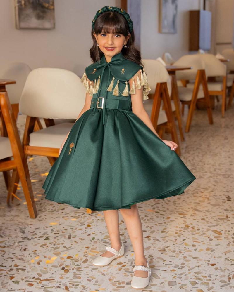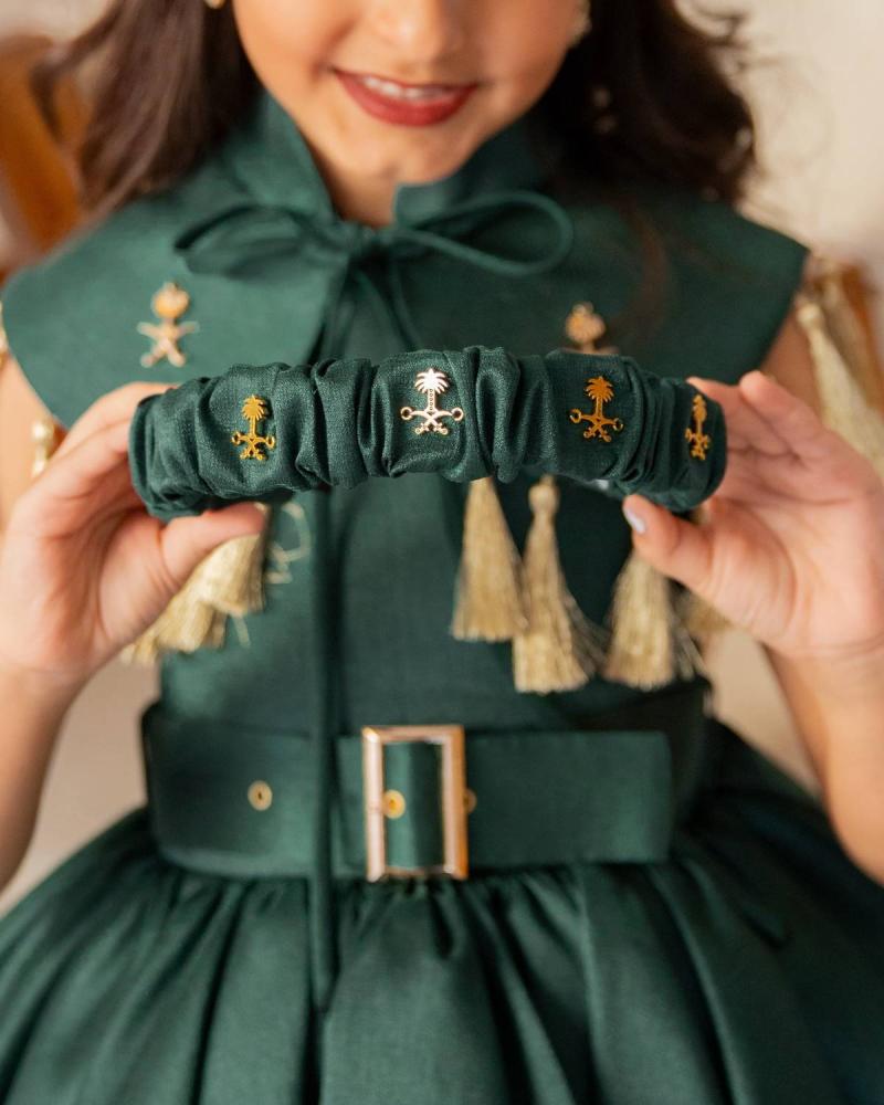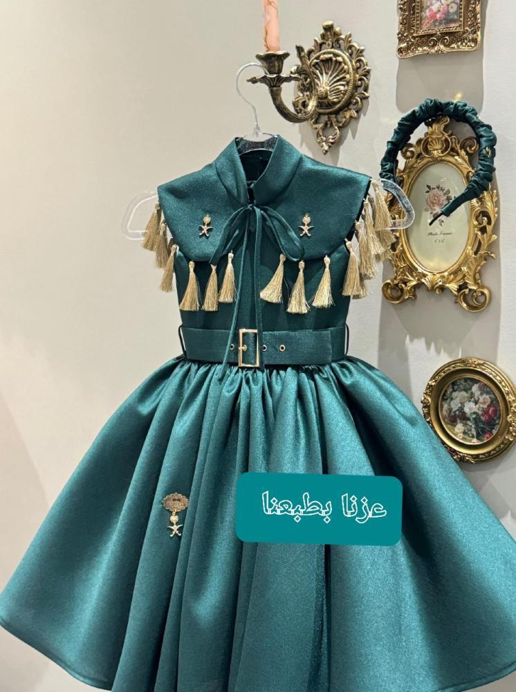 يتميز فستان عزنا بتصميمه الجديد والحصري، مما يجعله خياراً فريداً للاحتفال باليوم الوطني.