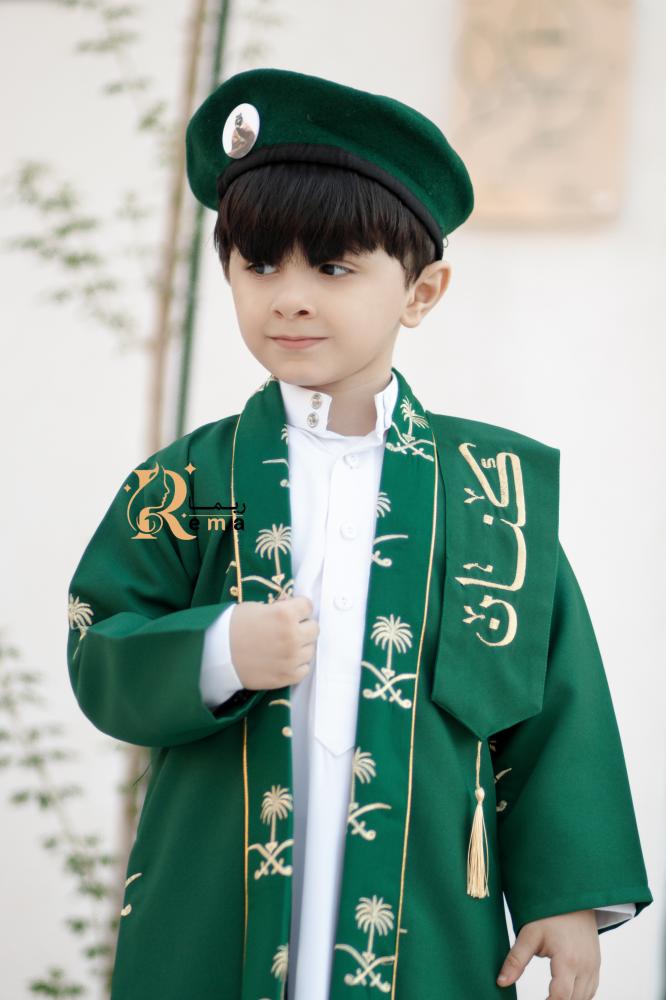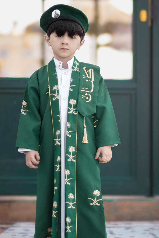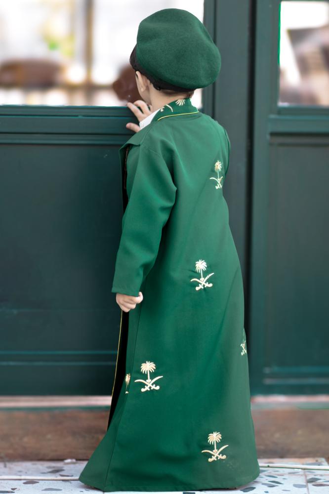 فستان بتصميم بشت وطني اخضر مع وشاح قبوع مطعم بسيفين ونخله