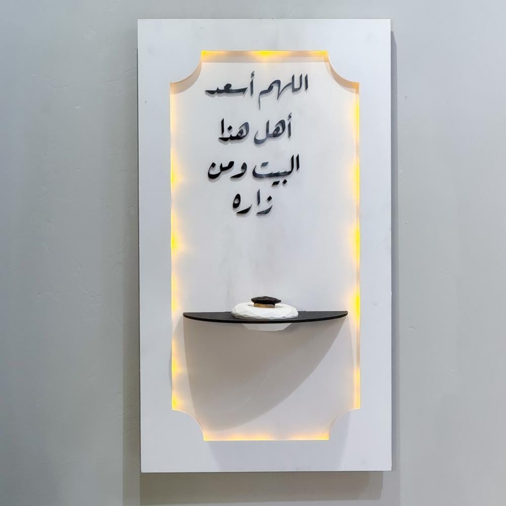 تتميز اللوحة بإطار أبيض أنيق مزود بإضاءة خلفية خافتة تُبرز عبارة محفورة بخط عربي جميل تقول: