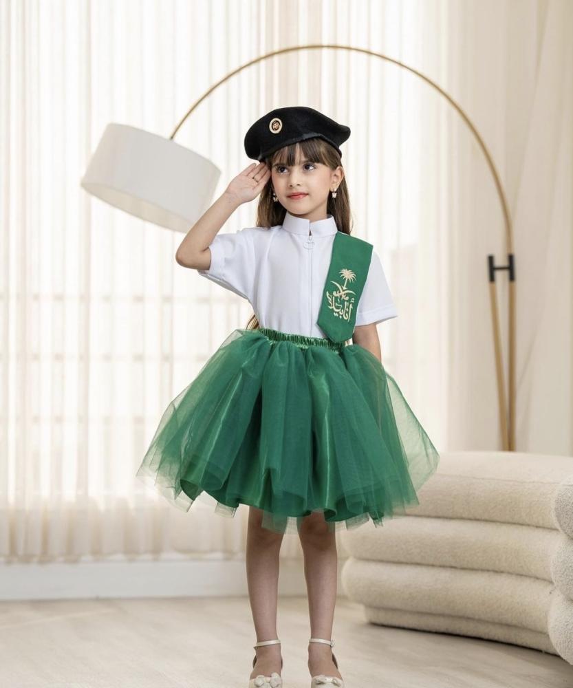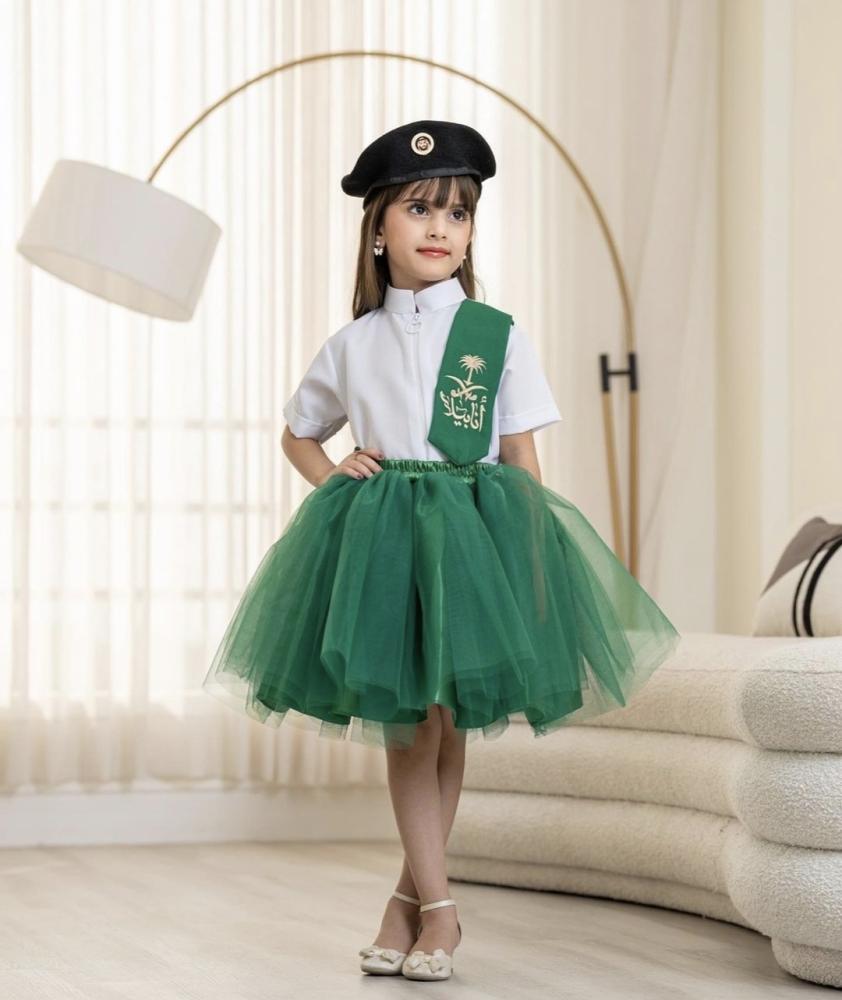 طقم تنوره مع قميص بشعار اليوم الوطني بتصميم انيق , مصنوعة من أجود أنواع الأقمشة لتناسب نعومة طفلك ليكن أنيق بطلته الجميلة.