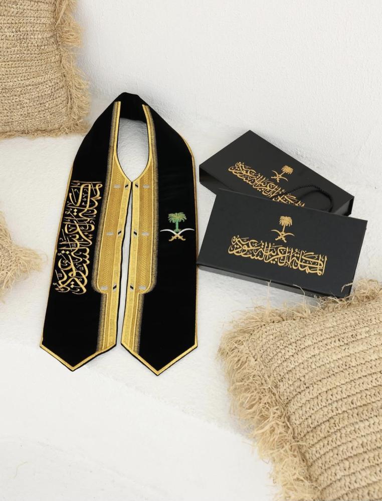 مطرز بالزري الذهبي بدقة البشت السعودي مع شعار واسم المملكة المكتوب يدويا بالخط العربي