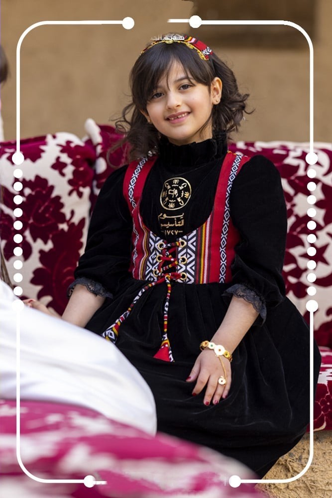 التاسيس ، مما يجعل هذا الفستان لا غنى عنه لكل أميره صغيره .حيث تم اختيار قماش المخمل ليتلائم مع اجواء الطقس بيوم التاسيس